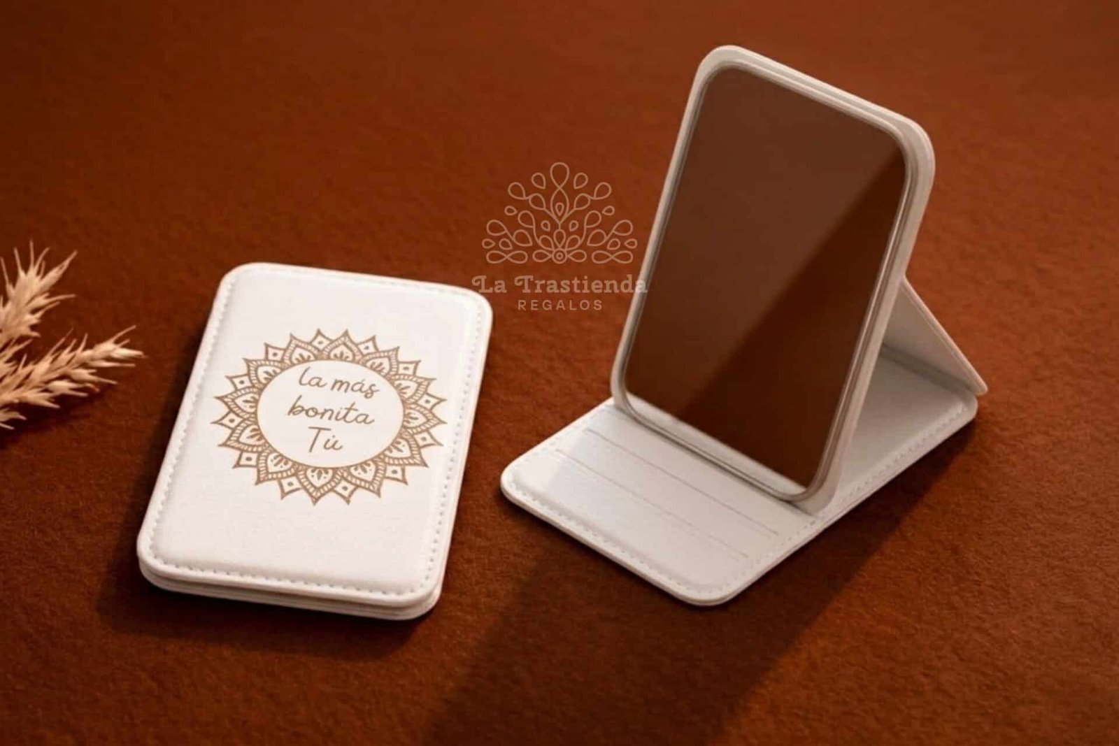 Descubre este espejo de bolsillo personalizado grabado, un detalle único y práctico perfecto para regalar en cualquier ocasión especial. Su diseño compacto y plegable lo convierte en el complemento ideal para llevar en el bolso, mochila o neceser.