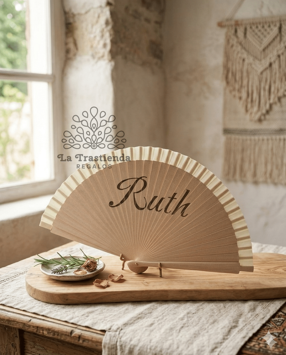 Este abanico de madera grabado a láser es el detalle perfecto para eventos especiales o para quienes buscan un complemento práctico con un toque único y artesanal.