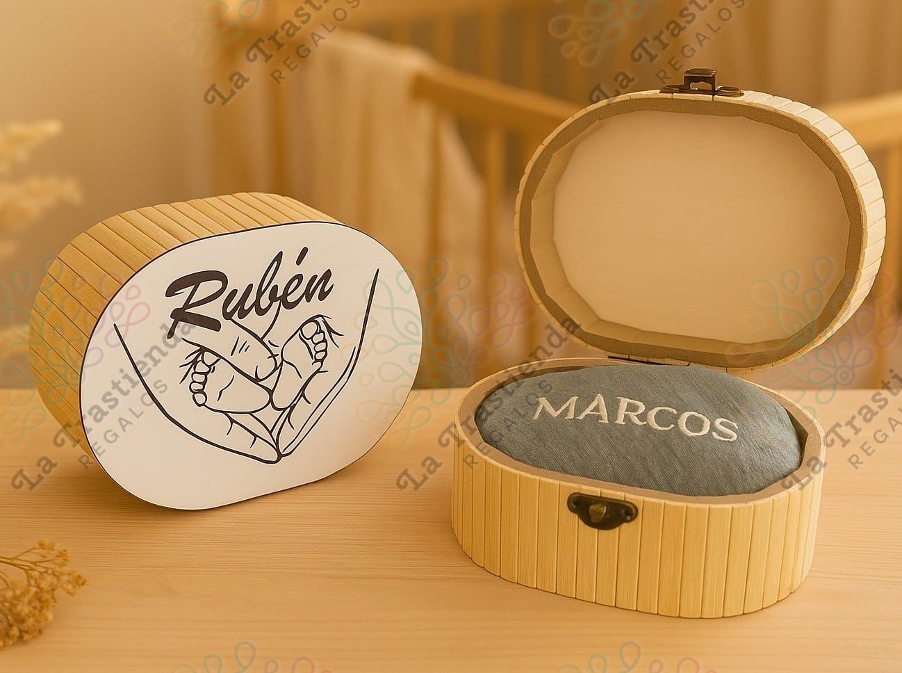 Un recuerdo único para los primeros tesoros de tu bebé. Caja grabada con su nombre + muselina suave bordada.